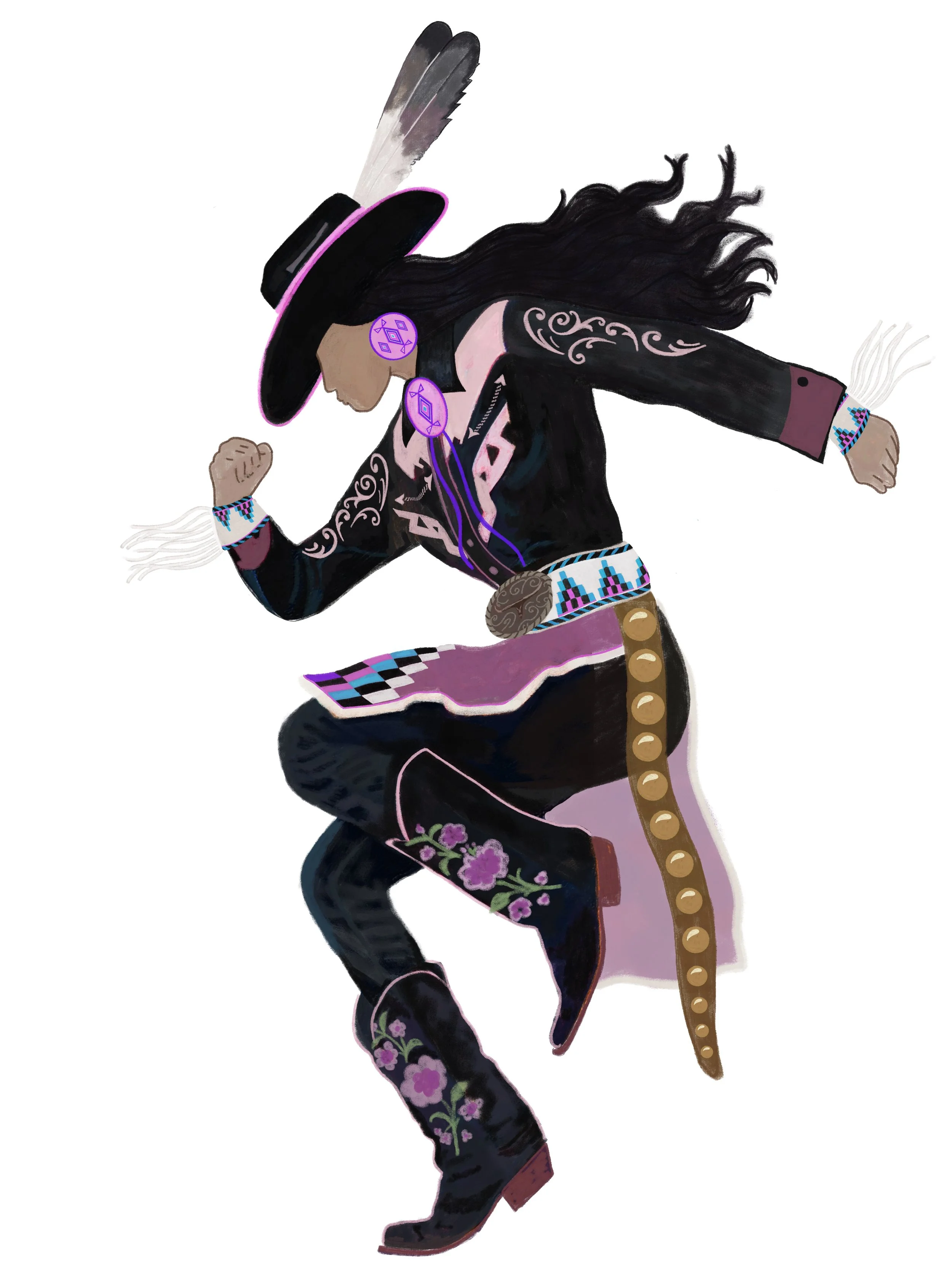 The Hat and Boot Dance originated through a crossover between powwow and rodeo communities. Following rodeo events, cowboys would gather at the powwow grounds, drawn by the drum and the energy of the circle. At times borrowing elements of regalia—such as a fan, staff, or bustle—cowboys entered the arena in a hybrid attire that merged cowboy dress with powwow regalia.